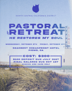 Join us for a time of rest, reflection, and renewal by the ocean. We invite all pastors within our district to come away and be refreshed in God’s presence.